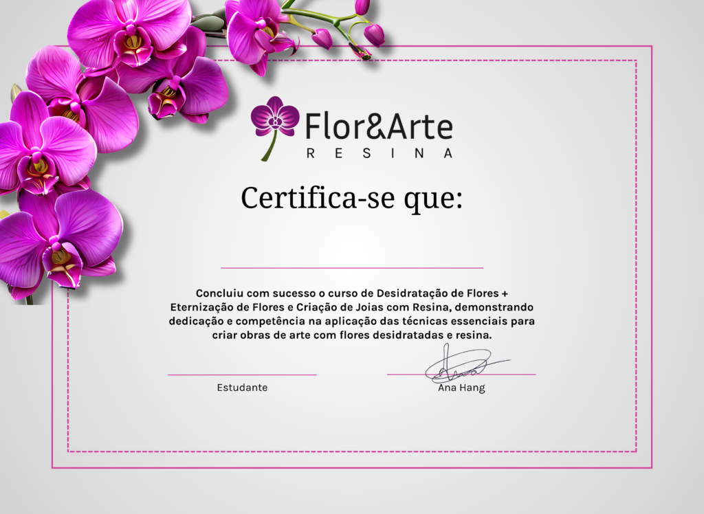 Parabéns! Ao concluir o nosso curso de Resina, receberá um certificado que reconhece a sua dedicação e competências no fascinante mundo da arte em resina.